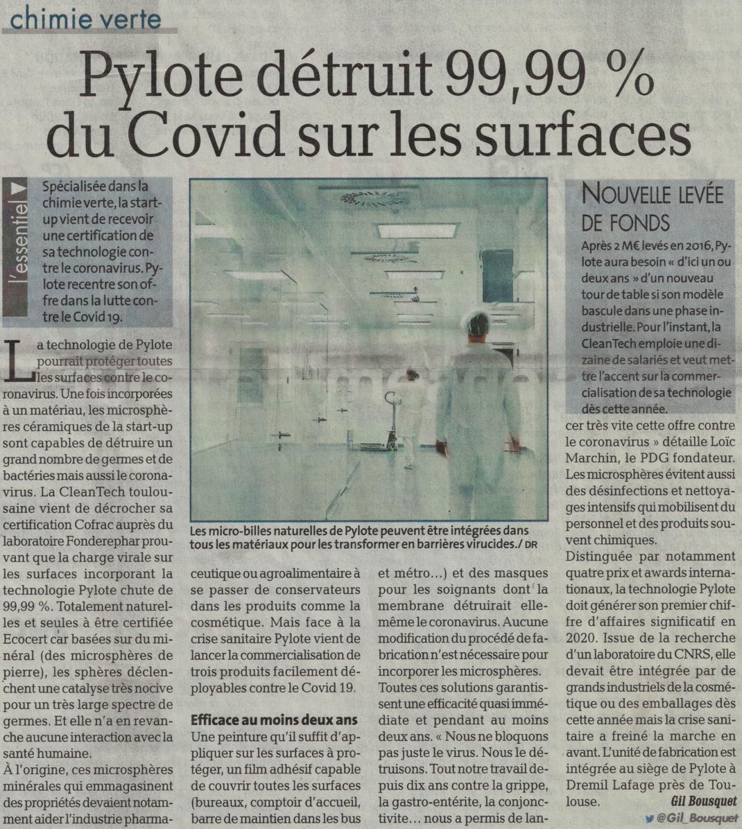 La société Pylote, membre de BIOMED Alliance est mis en avant dans La dépêche cette semaine suite à sa certification COFRAC concernant sa technologie totalement naturelle de microsphères céramiques qui une fois incorporées à n’importe quel matériau permet de le rendre virucide.